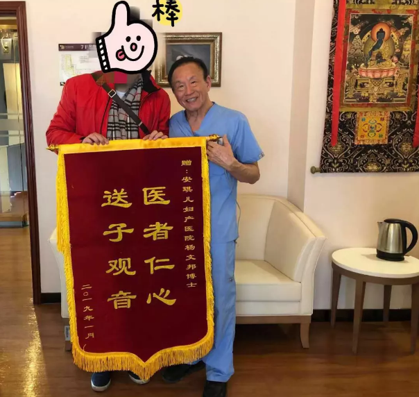 2019年1月22日,正值孩子周岁生日,李女士的丈夫不远万里从香港赶来,亲自到安琪儿国际部杨文邦博士的办公室致谢并送上锦旗,以这种特殊的方式纪念一年前这难忘的圆梦一刻。