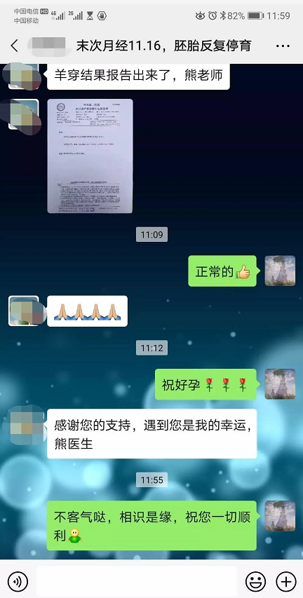 因43岁高龄,孕18周时按要求去做了羊水穿刺,结果出来的第一时间,她立刻给熊医生发来消息,被告知羊穿已经成功通过后,看得出来她如释重负。不得不感叹生命与生命之间这份“迟到”的缘分。